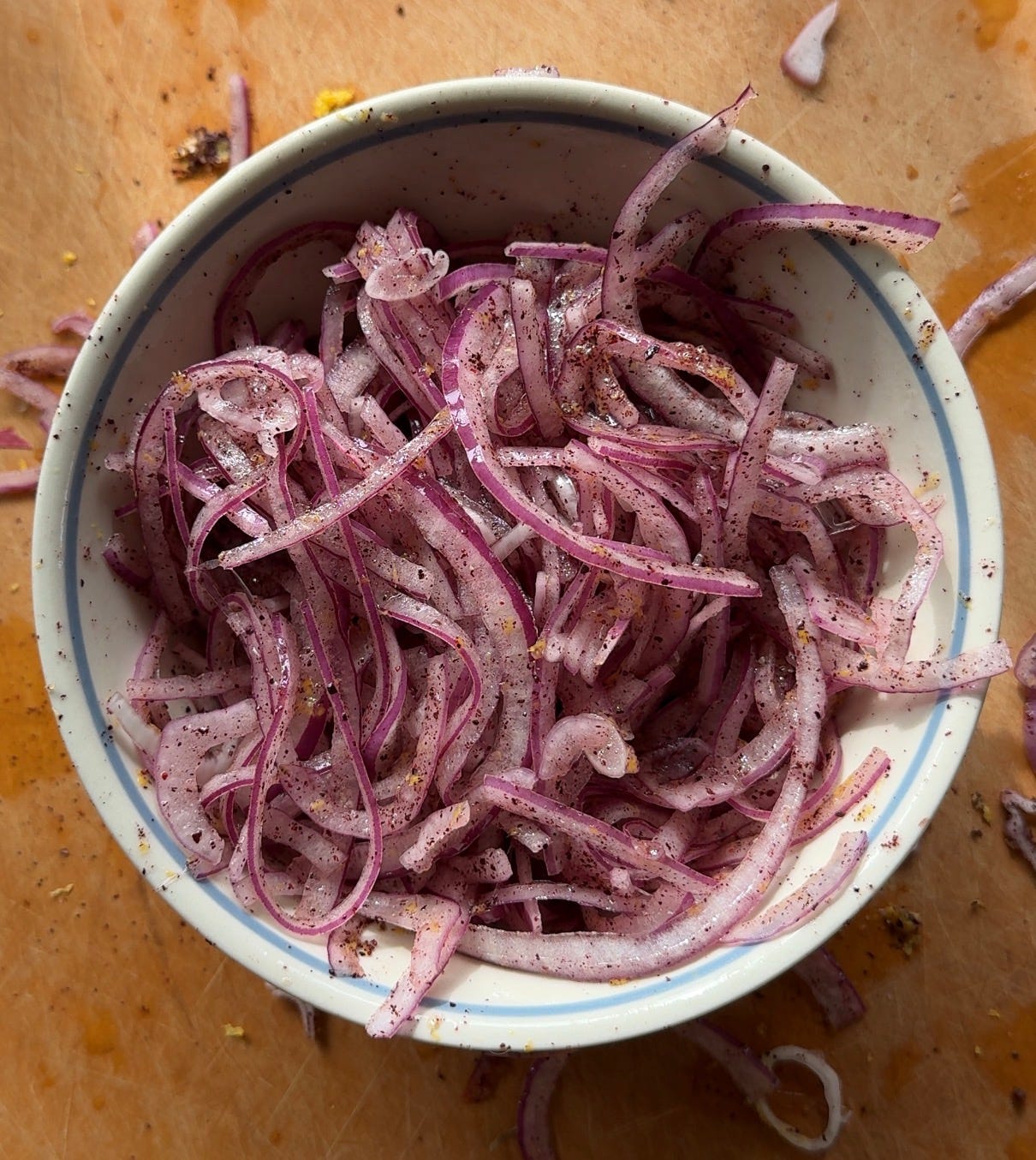 To quick-pickle/marinate your onions, toss the thinly sliced red onion with the sumac, lemon zest, and lemon juice, and let sit while you prep the rest of the ingredients — 15-20 minutes should be sufficient. I only used about half of these for the salad, though you could add more. They’re also good on salads, grain bowls, tacos, eggs — whatever!