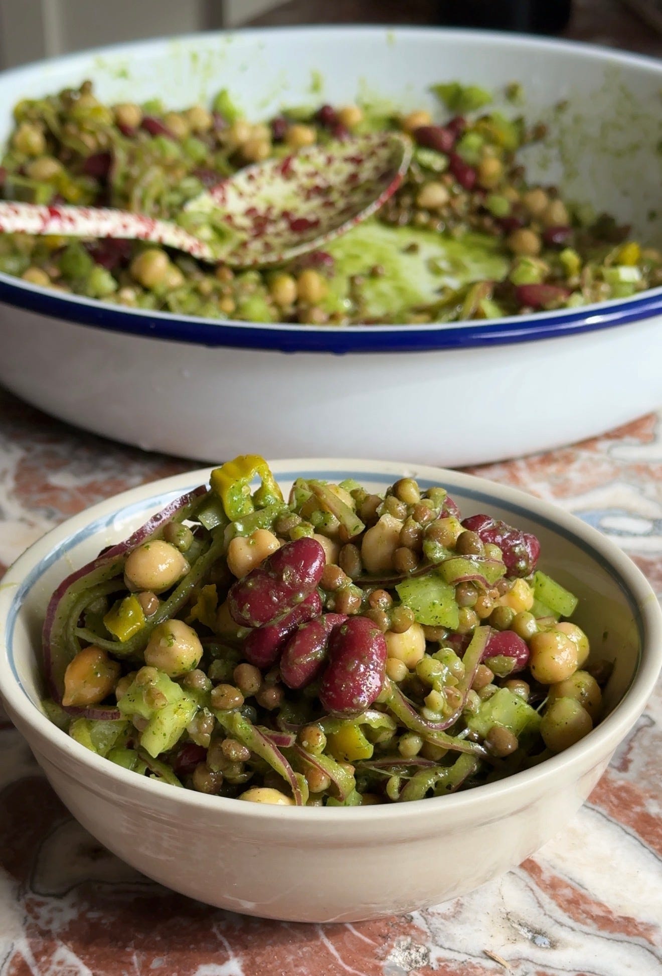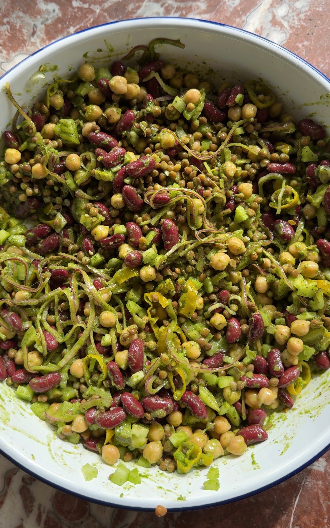 A mélange of lentils, chickpeas, and kidney beans tossed with quick-pickled sumac red onions, dill pickles, and pickled pepperoncinis, along with a delightfully spicy and herby dressing.